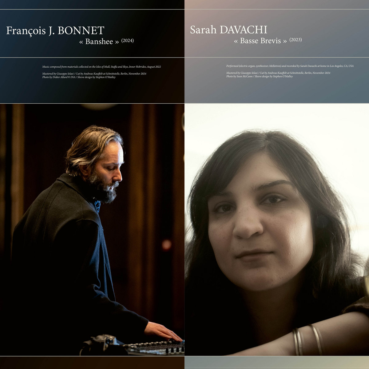 Price (incl. 19% VAT): €25.00 More Infohttps://portraitsgrm.bandcamp.com/album/banshee-basse-brevisFrançois J. Bonnet – Banshee Banshee is an ear directed towards the edges of the old world, where these infinite fines terrae cut and fractalize into coasts, harbours, fjords, peninsulas and archipelagos. Drawing its raw material from recordings made in the Inner Hebrides, Banshee tightly weaves a fabric where the sonic avatars of fauna, flora and climate merge with the human presence, its tools and its culture. Thus, a small boat cleaving through a loch becomes the voice of the mountains and wilderness, and the howling of the wind on the moors becomes the lament of a Banshee, harbinger of death, messenger of the Other World. Sarah Davachi – Basse Brevis Co-commissioned by Radio France and INA grm, Basse Brevis by Canadian composer Sarah Davachi was premiered at the Présences 2024 festival, which was dedicated to Steve Reich. Drawing on her own minimalist approach, Sarah Davachi explores, with extreme care, the weavings and complex relationships between the timbral, spatial and durational components of music. Using developments that can be appreciated over time, the composer manages to create music that is extremely precise, subtle and lively. But what is striking, and particularly evident in Basse Brevis, is that such an approach, both abstract and restrained, is nonetheless at times utterly poignant. The work combines moments of formal exploration with moments of pure emotion in a perfectly mastered fashion, creating a gentle tension as it swings between two modes of listening that navigate indecisively within both instrumental and concrete approaches, tracing, in parallel, a diagonal of sound that unfolds around perception, sensation and feeling. François J. BONNET « Banshee » (2024) Music composed from materials collected on the Isles of Mull, Staffa and Skye, Inner Hebrides, August 2022 Mastered by Giuseppe Ielasi / Cut by Andreas Kauffelt at Schnittstelle Photo by Didier Allard © INA / Sleeve design by Stephen O’Malley — Sarah DAVACHI « Basse Brevis » (2023) Performed (electric organ, synthesizer, Mellotron) and recorded by Sarah Davachi at home in Los Angeles, CA, USA Mastered by Giuseppe Ielasi / Cut by Andreas Kauffelt at Schnittstelle Photo by Sean McCann / Sleeve design by Stephen O’Malley |