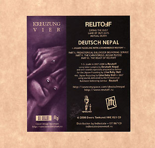 Price (incl. 19% VAT): €14.00 More InfoDer vierte und letzte Teil der KREUZUNG-Serie! Sechsmal flirrender, hektischer, düsterer Elektro-Industrial & Dark Ambient der intelligenten Sorte. Hiervon gibt es leider nur 400 Stück!"The fourth issue in a series of collaborations between Reutoff and their friends. This issue includes 3 tracks from Reutoff based on the source material by Deutsch Nepal and 3 tracks suite called “Jigsaw Puzzeling With A Dismembered Reutoff” created by Deutsch Nepal using the sounds delivered by Reutoff. The release comes in a special "Kreuzung" series package made of brown kraft carton with a full colour stickered artwork/info cover and Reutoff logo embossed on the back, the CD is housed in the same carton die-cut inner envelope. 6 tracks, 50 mins in total. First edition of 400 copies." [label info] |