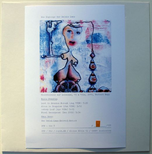 Price (incl. 19% VAT): €20.00 More Info"Now here is one of those names which I remember seeing in the past, and even have a couple of pieces on that Bain Total compilation LP (from 1980), but honestly don't remember, nor having heard any of their other work. I do remember they released two flexi discs, which I thought was cool. I am quite surprised to see they are still around and apparently they never stopped. This seventh installment of split LPs by Mama Baer and Kommissar Hjuler has five pieces by them, from 1994 to 2005. Bomis Prendin sound very much like boys who never grew up. If you are old enough to remember the late 70s/early 80s were a fertile ground for experimenting with sound, usually from a rock context. Armed with guitars, bass, drums, keyboards but also toys and loose circuits they create what was then called 'no wave', and after thirty years Bomis Prendin still manages to create the same kind of music, like they never learned a bit on their guitar, or notions about melody, rhythm, timbre. A very free sound- the real anybody can do this. I have no idea if these tracks are very representative of the old sound, but somehow I think they do. In their most recent piece they sound suddenly strangely coherent - hammering away in free rock mode. I was playing some old Metabolist record the other day, and this came close to that. Excellent (re-)discovery. On the other side we have Mama Baer, solo this time. Her work, either solo or Der Kommissar, always leaves me puzzling, to say the least. They seem to be operating very much on the outside of the musical spectrum, with what seems at times therapeutic music. Here however there is one piece that covers the entire side of the record of tape (reel-to-reel) manipulations which sound like an older Nurse With Wound record of manipulated voice (pitched up high) and a woman moaning, far away percussion and microphone abuse. Excellent piece all around. Very thoughtful, so these people aren't that crazy I thought." [FdW/Vital Weekly] www.psych-kg.de |