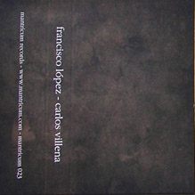 Price (incl. 19% VAT): €8.00 More Info"The other tape is a split with Carlos Villena. Lopez as well Villena uses field-recordings from nature. Both musicians create a quiet atmosphere by the sounds of water, crickets, ducks and other animals. Lopez repeats some sounds and edited them in a small ways, so the natural sound becomes more stylized in a minimal ways. He creates a flow of sounds, but he decides not fade away and fade into the other parts of the composition, but he does a cut between these parts, as if the different fields are not connected with each other. The tape side of Villena starts noisy with strong water sounds and becomes in first sight more and more abstract and later on more relaxed and calm. Great tape with subtile edited field recordings." [JKH/Vital Weekly]www.mantricum.com |