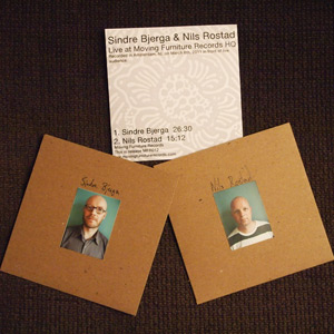 Format: CD-R Label & Cat.Number: Moving Furniture Records MFR012 Release Year: 2011 Note: two long pieces on this very limited (50 copies) CDR with handmade artwork (incl. 2 original photos): 26 min. well designed experimental drone from SINDRE BJERGA, 15 min strange acoustic guitar tunes from NILS ROSTAD, recorded on the same evening...