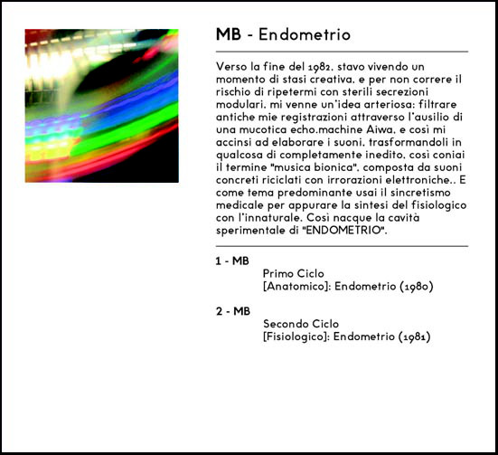 Price (incl. 19% VAT): €17.00 More Info"Towards the end of 1982, I was living a moment of creative stagnation, and for avoid the risk of repeating myself with sterile modular secrations, I had an arterial idea: filering ancient recordings of mine through the aid of an Aiwa mucus echo machine, and so I set to process the sounds, transforming them into something completely new, so I coined the term “bionic music”, composed by concrete sounds recycled with electronic spraying…And as main theme I used the medical syncretism to ascertain the synthesis of physiological with unnatural. Thus was born the experimental cavity of "ENDOMETRIO". - MAURIZIO BIANCHI +++++++++++ After the re-mastered and De-Composed re-edition of “S.F.A.G.”, OEC is proud to affer a new re-edition of another seminal and innovative album by the MB of the very first era. This is one of the first chapters in the Industrial movment. "Endometrio" was first released in 1982 by MB and is one of the first and seminal albums of the Industrial movment de-composed and self-released by Maurizio Bianchi. This new re-edition was completely remastered and is offering a second CD with 2 re-mixes of the original tracks made by two primer Italian projects of the Industrial and Experimental-Ambient scene. A milestone which can finally be heard with best sound standards but with the old spirit of his original roots. And re-listen it in the "de-composed" versions by BAD SECTOR and SIGILLUM S, two primer projects of the Italian Industrial and Dark scene." www.oldeuropacafe.com |