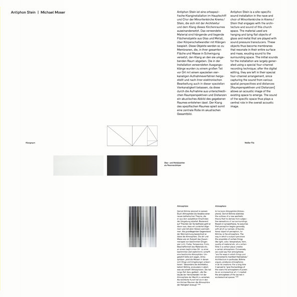 Price (incl. 19% VAT): €30.00 More Info"Klanginstallation im Hauptschiff und Chor der Minoritenkirche Krems/Stein.Pre-recorded source materials: Klaus Lang: organ (Stiftskirche St Lambrecht, Pfarrkirche St. Oswald, Krakaudorf; Minoritenkirche) Berndt Thurner: percussion (Minoritenkirche) Michael Moser: glass plates, electronics ANTIPHON STEIN ist eine ortsspezifische Klanginstallation im Hauptschiff und Chor der Minoritenkirche Krems/Stein, die sich mit der Architektur und dem Klang dieses Kirchenraumes auseinandersetzt. Das verwendete Material sind hängende und liegende Flächenobjekte aus Glas und Metall, über Körperschallwandler mit Klängen bespielt. Diese Objekte werden so zu Membranen, die, in ihrer gesamten Fläche und Masse in Schwingung versetzt, den Klang an den sie umgebenden Raum abgeben. Die in der Installation verwendeten Ausgangsklänge wurden zu einem großen Teil vor Ort mit einem speziellen vierkanaligen Aufnahmeverfahren hergestellt und nach ihrer elektronischen Bearbeitung auch in dieser speziellen Vierkanaligkeit belassen, da diese durch die Aufnahme aus unterschiedlichen Raumperspektiven und Distanzen ein akustisches Abbild des gegebenen Raumes entstehen lässt. Der Klang des spezifischen Raumes spielt somit eine zentrale Rolle im akustischen Gesamtbild. Die Positionierung bzw. Hängung der Flächenobjekte führte durch die Strenge der frühgotischen Architektur zu der zweiteiligen, responsorienartigen Form der Arbeit: unten im Hauptschiff die acht Glasplattenobjekte jeweils zwischen den mächtigen Säulen hängend, oben im ehemaligen Chor die dreiteilige, am Boden auf weißen Filz wie schwebend angeordnete, und daher von unten nicht sichtbare, aber dennoch hörbare Metallarbeit. Die Intimität der Apsis mit ihrem Triptychon aus Metallobjekten kontrastiert die Weitläufigkeit des Hauptschiffs mit seinen in großer Distanz hängenden Glasflächen. Der Verlauf der Lichtgestaltung, vom dunklen Hauptschiff zur lichtdurchfluteten hellen Apsis, versucht diesen Dialog fortzuführen. Die Klänge, kleine kompositorische Miniaturen mit Dauern von 3 bis 7 Minuten ¿ oben eher Orgel- unten mehr Becken-Klänge, Perkussion, bespieltes Glas ¿ werden vom Computer auf Basis einer genauen Ablaufpartitur immer wieder in neue Konstellationen gebracht: teilweise aleatorisch, teilweise in fixierter Reihenfolge und unterbrochen von Interludien, die im zeitlichen Abstand von 30 Minuten den einzigen Moment darstellen, in dem ein einzelnes Soundfile auf alle Flächenobjekte der beiden Räume gleichzeitig zugreifen kann. Gesamtspielzeit: ca. 80 min" www.edition-rz.de |