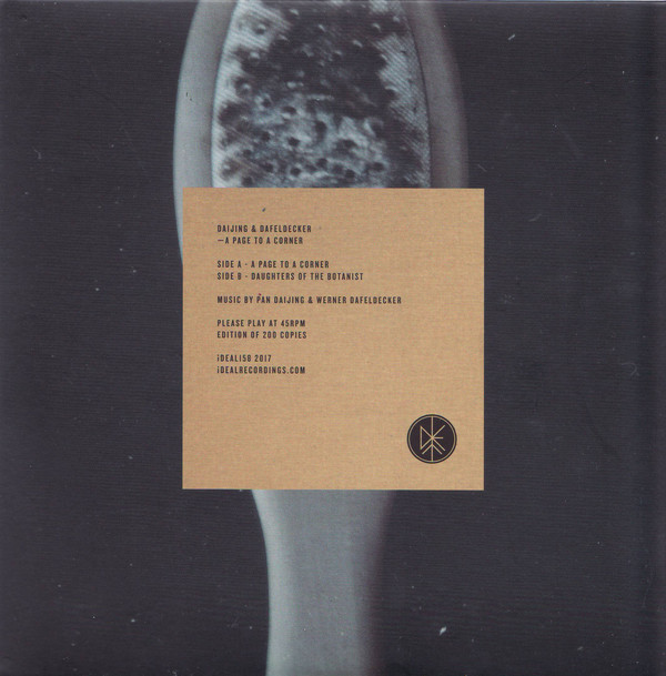 Price (incl. 19% VAT): €11.00 More Info"The unfathomable quantity of Pan Daijing meets Werner Dafeldecker’s mercurial sound art on this surprise, limited edition 7" pressing.Leading on from her heavily arresting Lack album for the PAN label, A Page To A Corner is Daijing's first collaborative release. The title track is a lethargically hypnagogic thing, with Daijing lamenting an unseen force, bound into a mesh of monotone drones and keening strings to ultimately quease-inducing effect. On the B-side, Daughters of The Botanist, Daijing's death croak vocals are placed front and centre of the mix against a more dynamic backdrop of gong-like tones that gradually recede to leave the slithering sound of extended instrumental techniques and brownian electronics." |