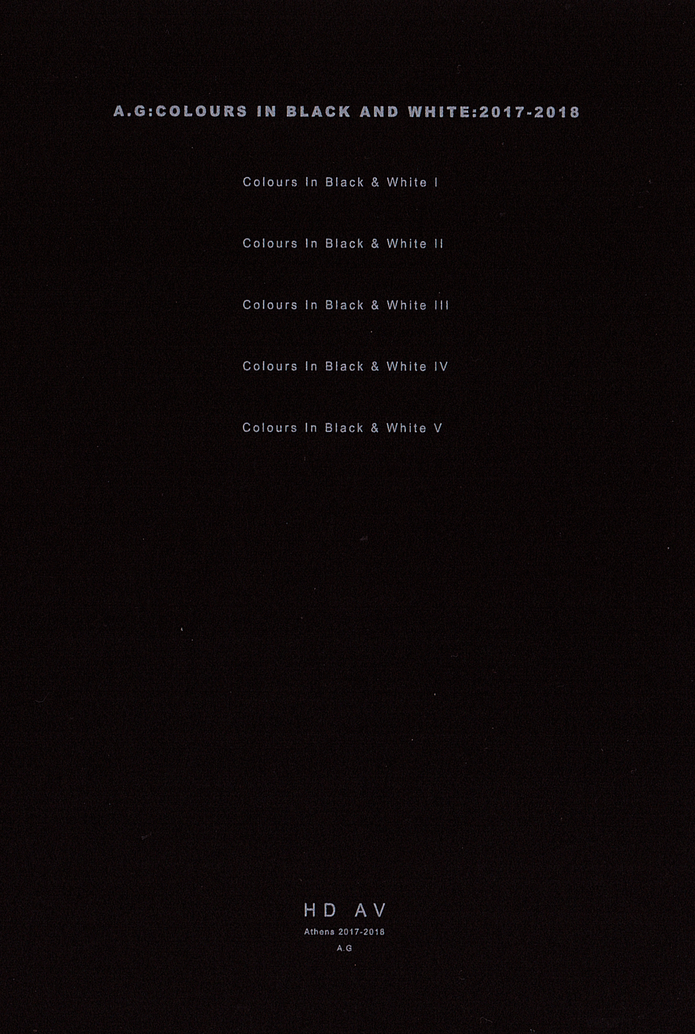 Price (incl. 19% VAT): €12.00 More InfoColours In Black & White (DVD / HD AV), consists of five parts, is the new audiovisual artwork by A.G created from 2017 to 2018. This project is an approach of - Digital Visual Music - in linear process, intersecting the aesthetics of new media art and post-minimal composition, as well as experimenting with the bounds of static and moving imagery next to the music in slow motion. The visuals were developed by the transformation and multiplication of a single video signal through digital post-production, resulting into an abstract black & white video synthesis.Titles : Colours In Black & White I : 2017 (Duration 25:00) Colours In Black & White II : 2017 (Duration 30:15) Colours In Black & White III : 2018 (Duration 25:33) Colours In Black & White IV : 2018 (Duration 28:15) Colours In Black & White V : 2018 (Duration 18:50) __________________________________________________________________________________________________________ A.G is a media artist based in Athens & Paris. He has released studio albums and audiovisual works under the names of ANIKA and A.G. In 2015 he reinterpreted three compositions of Erik Satie in the 3CD compilation ERIK SATIE ET LES NOUVEAUX JEUNES 2 (incl. Max Richter, Peter Broderick, Sylvain Chauveau, Rachel Grimes & Dustin O'Halloran), released by french label Arbouse Recordings. He has participated in various collective exhibitions where he presented audiovisual artworks and has collaborated with Free103Point9 Transmission Arts organization for Noise!2009 Festival (Ontological Hysteric Theater) in New York. A.G Works : 2005 ANIKA:A:0304 (MLP) 2008 ANIKA:A:0507 (LP/CD) 2009 ANIKA: 33 RECORDING SESSIONS, NOT INCLUDED IN A:0507 (CD-R) 2010 A.G:POLYGON:08 (CD) 2014 A.G:VIDEOS:2003-2013 (DVD-R) 2015 ERIK SATIE ET LES NOUVEAUX JEUNES 2 (3CD Compilation) 2018 A.G:COLOURS IN BLACK AND WHITE:2017-2018 (DVD-R) Videos : Colours In Black & White I (25:00) : https://www.youtube.com/watch?v=dhf0LEUunfU Colours In Black & White II (30:15) : https://www.youtube.com/watch?v=m8DK3WZgGts Colours In Black & White III (25:33) : https://www.youtube.com/watch?v=gs6VaQjEL0k Colours In Black & White IV (28:15) : https://www.youtube.com/watch?v=25dV70HXzJY Colours In Black & White V (18:50) : https://www.youtube.com/watch?v=ztCprALWI3Q&t=336s Links : A.G:POLYGON:08 http://agpolygon08.blogspot.com ANIKA:A:0507 http://anika-a0507.blogspot.com A.G:VIDEOS:2003-2013 http://ag-videos2003-2013.blogspot.com A.G:LIVE AT FENAILLE MUSEUM. RODEZ:20.05.17 https://www.youtube.com/watch?v=FLRD4yPV0J4 FREE 103 POINT 9 / TRANSMISSION ARTS https://wavefarm.org/ta/artists/xnc29y RE:VOIR http://re-voir.com/shop/en/film-revoir-experiemental-film-dvd/786-ag-videos-2003-2013.html _ |