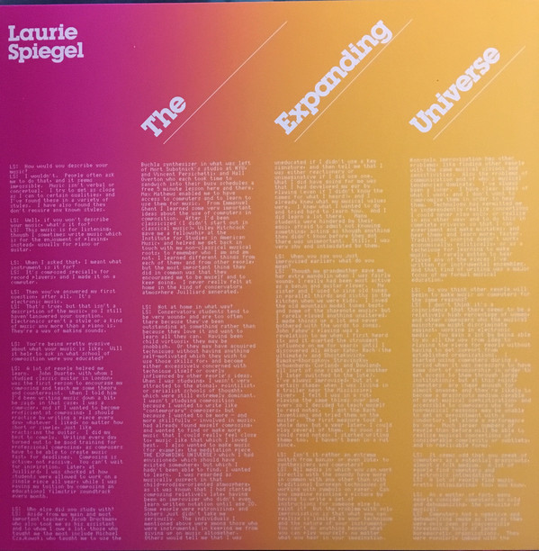 Price (incl. 19% VAT): €42.00 More InfoThe Expanding Universe is the 1980 debut album by computer music pioneer Laurie Spiegel. The original album is reissued here as a massively expanded 3LP/2CD set, all four original album tracks plus an additional 15 tracks from the same time period, many making their first appearance on vinyl in this brand new edition. Since this album's first CD reissue in 2012, it has gone on to be widely established as a classic of 20th century electronic music. Some of the well-loved works included in this set are "Patchwork", the "Appalachian Grove" series, "East River Dawn" and "Kepler's Harmony of the Worlds", which was included on the Golden Record launched on board the Voyager spacecraft. The pieces comprising The Expanding Universe combine slowly evolving textures with the emotional richness of intricate counterpoint, harmony, and complex rhythms (John Fahey and J. S. Bach are both cited as major influences in the original cover's notes), all built of electronic sounds using the GROOVE system at Bell Laboratories during the 1970s.https://unseenworlds.bandcamp.com/album/the-expanding-universe |