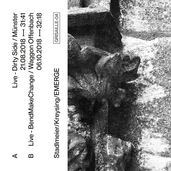 Format: MC Label & Cat.Number: Grisaille 04 Release Year: 2019 Note: two live recordings (Münster + Offenbach, 2018) of SASCHA STADLMEIER aka EMERGE with accordeonist ANJA KREYSING, a kind of sister-release to the recommended "Re-Encypher" CD (Attenuation Circuit) => subtle accordeon harmonics and micro-sounds from it, dark mysterious loops, noises and drones.. a very nice tape! Lim. 70, C-65, printed cover