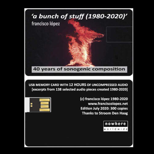 Price (incl. 19% VAT): €34.00 More Infoa bunch of stuff (1980-2020) - 40 years of sonogenic composition.Released on a USB memory card, a bunch of stuff (1980-2020) - 40 years of sonogenic composition tracks four decades worth of material from avant-garde experimental musician Francisco López. Featuring 12 hours worth of uncompressed audio, it’s restricted to a 300-strong hand-signed run. |