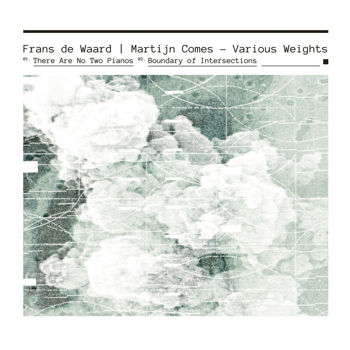 Price (incl. 19% VAT): €12.00 More Info"Various Weights is the first time the duo of Frans de Waard and Martijn Comes come together to present work.On this album, their uniques styles are combined, where they work with each others sound materials to create truly unique compositions. Various Weights In sound art, concepts often take precedence over the actual music. Here, there were none. For their first collaboration, Frans de Waard and Martijn Comes decided on a strikingly simple approach: Each artist compiled a pool of sounds for the other to use as a point of departure. Comes worked with various analog synth- and field recordings by de Waard (including, among others, a Korg MS20 and Koma Field FX). The latter was sent a processed stylophone recording, a sample loop as well as recordings of the Web’s first Software-Defined Radio by the University of Twente. The results, now released as Various Weights, are two epic and immersive pieces. On “Boundary of Intersections”, Comes focuses on deep sonorities and harmonics, developing his materials into a mind-expanding drone zone. De Waard’s “There are no two pianos” is more subdued, hovering mysteriously at the cusp of acousmatic research and sonic minimalism. Both pieces share a slightly uneasy, surreal feeling – perfectly captured by Bas Mantel’s artwork, which was a direct response to the sounds contained on the disc. The bonus-CD to this release, limited to 50 copies, contains a full 35-minute performance by both artists at De Ruimte Amsterdam after the project had been completed. Magically, the music appears to be a direct continuation of the album tracks. As such, Various Weights ingeniously juxtaposes live- and studio techniques, solo and duo work, spontaneous improvisation and meticulous composition. That, whether the artists intended it that way or not, probably makes it a concept album after all." Tobias Fischer, March 2020 https://www.movingfurniturerecords.com/frans-de-waard-martijn-comes-various-weights/ |