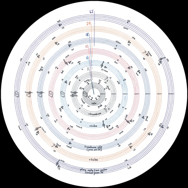 Price (incl. 19% VAT): €25.00 More InfoRobin Hayward (b. 1969 in Brighton, England) is a tuba player and composer based in Berlin. Since the 1990s, he has been concerning himself with experimental and radical playing techniques on brass instruments, initially through the discovery of the "noise-valve", later through development of the first fully microtonal tuba in 2009. In 2012, he invented the Hayward Tuning Vine as an interface for exploring the harmonic space implicit within the instrument, which exists both as a software version and as a physical prototype. Hayward's microtonal tuba and, on some occasions, the tuning vine have appeared on numerous recordings with various ensembles, e.g. Tonaliens – who have released a double LP on Edition Telemark in 2017 –, Chora(s)san Time-Court Mirage, and Microtub."Words of Paradise" is a 2016 recording performed by Zinc & Copper, Hayward's long-running brass chamber ensemble, featuring himself on tuba and tuning vine, Hilary Jeffery on trombone, and Elena Kakaliagou on horn. The piece was inspired by the ideas of 16th-century Dutch linguist Johannes Goropius Becanus, who thought he had shown the Flemish dialect Brabantic to be the original language spoken in Paradise. Observing Brabantic to have a higher proportion of single-syllable words compared to other languages, he reasoned that as the first language must have been the simplest, all languages must be derived from it. The composition draws on the sound of 13 single-syllable words that Becanus used to support his theories. Using half-valve and muting techniques, the inflections of speech and vowel sounds are imitated on the brass instruments, to which the Hayward Tuning Vine is played as a harmonic reference. LP Picture Disc replicating the multi-coloured circular scores of the horn and trombone parts of "Words of Paradise", housed in a black die-cut sleeve with liner notes on the rear side. Edition of 300. |