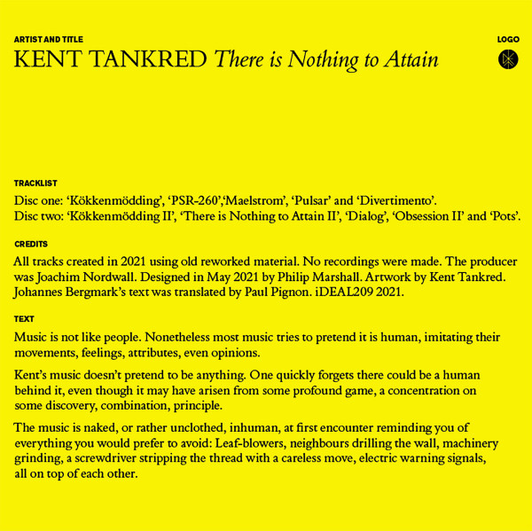 Price (incl. 19% VAT): €17.50 More InfoKent Tankred (b.1947) is one of the true hidden masters of Swedish electro-acoustic and experimental music. Tankred studied at Elektronmusikstudion in Stockholm in the early 70s and he has released a sparse catalogue of fine works, mainly for his and Leif Elggren’s Firework Edition Records as well as Ash International. In 1995 he put out the extremely strong album ”Ordinary Things” on Fylkingen Records. ”THERE IS NOTHING TO ATTAIN” is his first albums since the 2010 CDr with the same title. - iDEAL.* Music is not like people. Nonetheless most music tries to pretend it is human, imitating their movements, feelings, attributes, even opinions. Kent’s music doesn’t pretend to be anything. One quickly forgets there could be a human behind it, even though it may have arisen from some profound game, a concentration on some discovery, combination, principle. The music is naked, or rather unclothed, inhuman, at the first encounter reminding you of everything you would prefer to avoid: leaf-blowers, neighbours drilling the wall, machinery grinding, a screwdriver stripping the thread with a careless move, electric warning signals, all on top of each other. A recent radio programme was discussing whether the phrase “human error” should be replaced by the less recriminatory “human contribution”. Meanwhile a submarine has sunk into an ocean chasm and the 53 aboard who might still be alive will run out of oxygen before they can be reached. A struggle between man and machine. But here there is no struggle, the machine is likened to any other natural phenomenon. It just is, does what it does, or doesn’t, in its own time which is neither fast nor slow since it doesn’t have to be compared with anything, has no purpose, no significance, is neither good nor evil. A god like Einstein’s, indistinguishable from nature in its entirety. A galaxy does not rotate in order to be beautiful or strong. A fan does not make something flap about randomly in order to trace a certain pattern. In the starkly dystopic early science-fiction film On the Beach (1959) a Morse signal is detected from a region where all life should have been eradicated by the atomic winter. An expedition is sent to resolve the mystery. In a completely lifeless industrial zone they find that someone, before the radiation wiped them out, had hung a coke bottle on a string from a roller blind balanced so that the random flapping of the blind caused the bottle to press the telegraph key, producing a haphazard stream of code which inevitably from time to time formed meaningful words and phrases. I am hard put to explain what it is than can suddenly make the music so entertaining, so jocular in the midst of this objective, mundane mangling. Yet one does get reminded at some point that someone is behind all this, has discovered or molded, has chosen this; perhaps not a joke but pure serendipity. Just as things originate so must they vanish, by one decision or another – a handbrake, a puncture, a flying catch. The process “concludes”, or purports to, as when someone suddenly wakes you from a dream which you forget immediately but retain the echo of a feeling. Or you are surprised by your parents opening the door when you’re in the middle of a game where you can’t remember whether what you’re doing is supposed to be secret or not. And so the cauldron or the ventilation pipes spill out a bus garage, a swarm of drones, or those flying bicycles Leonardo had a mind to make. Johannes Bergmark. https://idealrecordings.bandcamp.com/album/there-is-nothing-to-attain |