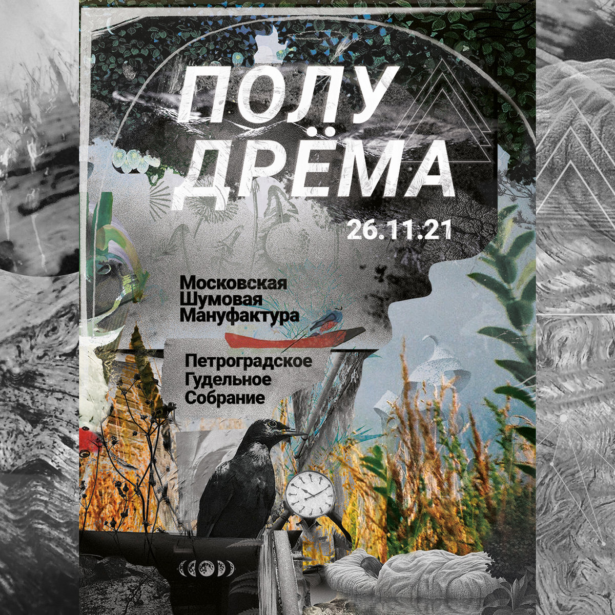 More InfoPetrograd Drone Gathering exists since 2016; this project was conceived by Evgenii Savenko as an ensemble of like-minded musicians from St. Petersburg, united by the common idea of free undulating musical expression, saturated with the forest psychedelia of the Karelian isthmus.Moscow Noise Manufactory is a similar creative union of metropolitan musicians, working in many genres from drone ambient and noise to psychedelic jazz and doom metal. The project was organized by Georgiy Orlov-Davydovskiy in the spring of 2021. In fact, both formations are live laboratories exploring the impersonal matter of sound, and the appearance of their joint recordings was just a matter of time. Such a recording was made at the “PoluDrëma” (“semi-slumber”) party, which took place on the night of November 26th-27th, 2021 at the Red Eyes Moscow club. From midnight until morning the St. Petersburg musicians played in sequence with artists from Moscow, for eight hours weaving a seamless fabric of oneiric sound for an audience which was either sleeping or drinking tea. These recordings were later edited in studio and condensed in two 45-minute pieces, showcasing all versatility of experimental ambient music. zhb.radionoise.ru/eng/zhb-lxxxvi.html * * * * * * * Петроградское Гудельное Собрание существует с 2016 года, этот проект был задуман Евгением Савенко как ансамбль дружественных музыкантов из Санкт-Петербурга, объединённых общей идеей свободного волнового звукоизвлечения, пропитанного психоделией лесов карельского перешейка. Московская Шумовая Мануфактура – похожий по своей сути творческий союз столичных музыкантов, работающий во многих жанрах от дроун-эмбиента и нойза до психоделического джаза и дум-метала. Проект был организован Георгием Орловым-Давыдовским весной 2021 года. По сути, обе формации представляют собой живые лаборатории по исследованию безличностной материи звука и появление их совместных записей было лишь вопросом времени. Такую запись удалось сделать в Москве на мероприятии "ПолуДрёма", прошедшем в ночь с 26 на 27 ноября 2021 в клубе Red Eyes. С полуночи до утра петербургские музыканты играли поочерёдно с московскими, на протяжении восьми часов сплетая бесшовную ткань онейрического звукового сопровождения для спящей или пьющей чай аудитории. Итоговые записи были препарированы в студии и сконденсированы в две 45-минутных пьесы, демонстрирующие всю многогранность экспериментального эмбиентного звучания. zhb.radionoise.ru/rus/zhb-lxxxvi.html credits released April 18, 2022 ZHB-LXXXVI Recorded live at PoluDrёma festival on 26.11.2021, Red Eyes Moscow. Petrograd Drone Gathering: Alexey Korablin (Reconstruction of Moss), Dmitry Maslyakov (Mira Drevo), Evgenii Savenko (Lunar Abyss), M.M. (Kryptogen Rundfunk), Pavel Dombrovskiy (uhushuhu), Lilia Akivenson (tremorkikimor), Alexandra Isaeva (Jum-Jum). Moscow Noise Manufactory: Georgiy Orlov-Davydovskiy (Yudol), Dmitriy Bubinskiy (Old Moss), Alexandra Isaeva (Jum-Jum), Vladimir Cherepanov (t_error 404), Philipp Datura (Datura Metel), Fedor Kovalev (Waldgrenze), Anton Kochubeev (Acanto), Alexey Vasilev (Droning Room), Boris Drone ([bɔː]), Alexandr Rust (Cotton Rust), Koloyar Dreved (Hladna), Ilya Suzdaltsev – moscownoisemanufactory.bandcamp.com Editing, mixing and mastering – Pavel Dombrovskiy, M.M., Georgiy Orlov-Davydovskiy, Gleb Ardabyev Artwork and design – Pavel Dombrovskiy, M.M. https://zhelezobeton.bandcamp.com/album/poludr-ma-26112021 |