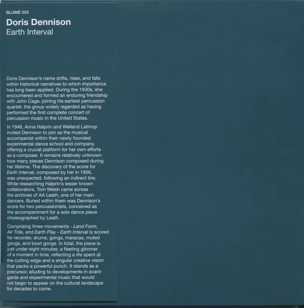 coloured vinyl, extensive 12" booklet, lim. 300 copies Price (incl. 19% VAT): €30.00 More Info300 copies. 140gr Audiophile pressing. Including printed inner sleeve housing a Nagaoka anti-static record sleeve, plus an original insert that functions as Obi. Comes with a large Photographic booklet including extensive liner notes, rare archival photographs, biographical essays on composer Doris Dennison and dancer AA Leath, and historical documentation of this pioneering 1956 percussion work*The discovery of Doris Dennison's score represents a genuine musicological breakthrough—what once would have been "a tree falling in the woods" thirty years ago now holds the potential to render "a thunderous clap in our minds." While researching Anna Halprin's lesser-known collaborators, scholar Tom Welsh uncovered the archives of AA Leath, one of Halprin's principal dancers. Buried within these materials was Dennison's handwritten score for Earth Interval, dated May 1956. Born in Saskatchewan, Canada, in 1908, and raised near Seattle, Dennison (1908-2009) encountered John Cage while teaching Dalcroze eurythmics at the Cornish College of the Arts. She joined Cage's earliest percussion quartet—alongside Margaret Jansen, the composer and his wife Xenia—in the group widely regarded as having performed the first complete concert of percussion music in the United States. This historic December 1938 concert was followed by tours and the landmark May 1941 performance at the California Club, comprising Cage and Lou Harrison's Double Music, the premiere of Cage's Third Construction, and Harrison's 13th Simfony. As Bradford Bailey observes in his extensive liner notes, Earth Interval demonstrates "an extraordinary balance of elements that imbues the piece with a sense of clarity, directness, and constraint that is both distinct and ahead of its time." The work's most remarkable innovation lies in its approach to extended techniques, particularly Dennison's notation for the central movement: "In 2nd movement, 1st player lowers + raises a gong into a tub of water while beating." This technique, absorbed from Cage's experimental vocabulary, generates what Bailey describes as "fields of acoustic abstraction that bend and warp time through sustained resonances, beat, and space." The temporal sophistication of these manipulations anticipated Karlheinz Stockhausen's Mikrophonie I (1964) and Annea Lockwood's water-based sound investigations by over a decade. After joining Mills College as dance accompanist, Dennison maintained crucial connections to the Bay Area's experimental scene, collaborating with figures like Merce Cunningham and programming Cage's music throughout the 1950s. Comprising three movements—Land Form, Air Tide, and Earth Play—Earth Interval is scored for recorder, drums, gongs, maracas, muted gongs, and bowl gongs. In total, the piece is just under eight minutes: "a fleeting glimmer of moment in time, a life spent at the cutting edge, and a singular creative vision that packs a powerful punch." When viewed in historical context, placed in contrast to roughly contemporaneous avant-garde percussion works by Cage, Harrison, Louis Thomas Hardin (Moondog), and Harry Partch, or important precursors like Edgard Varèse's Ionisation (1931) and Henry Cowell's Ostinato Pianissimo (1934), it's clear that Dennison was following her own path. Earth Interval is not derivative. It is a precursor to what was yet to come, alluding to developments of avant-garde and experimental music that wouldn't begin to appear on the cultural landscape until the 1970s and '80s, with the emergence of Post-Minimalism and more idiosyncratic artists and ensembles like Midori Takada, Ros Bandt, Peter Giger, Frank Perry, Christopher Tree, Michael Ranta, Gamelan Son of Lion, and Niagara. This recording by Chicago's Third Coast Percussion, captured in March 2022, represents the first complete documentation of this pioneering work. The ensemble's interpretation reveals the piece's remarkable contemporaneity while maintaining its historical specificity. Where Cage, Harrison, and Partch employed "self-consciously off-kilter polyrhythms," Dennison's rhythmic sensibility anticipates minimalist developments by nearly a decade, yet integrates "forceful rests, as well as sharp shifts in sonic character, tempo, and meter, that break the momentum and breathe a sense of life into the piece's structure." This positions her work closer to Post-Minimalism decades before its emergence. The architectural approach demonstrates Dennison's understanding that "the composer almost entirely disappears" in favor of phenomenological listening experience, creating what might be called an egoless music that places its realities and meaning entirely in the ear of the beholder. The present recording, realized by Chicago's distinguished Third Coast Percussion ensemble, represents a significant achievement in experimental music scholarship and performance practice. As specialists in the Cage tradition and contemporary percussion repertoire, Third Coast Percussion approached Earth Interval with the historical sensitivity and technical precision required to illuminate Dennison's subtle compositional innovations. The March 2022 recording sessions, engineered by Colin Campbell, capture both the work's intimate chamber music qualities and its bold exploration of extended techniques. The ensemble's interpretation reveals the piece's remarkable contemporaneity—its ability to speak directly to current musical concerns while maintaining its historical specificity. This recording serves multiple scholarly functions: it provides the first complete documentation of Dennison's compositional voice, offers insight into the broader network of experimental music practitioners surrounding Cage and Harrison, and demonstrates the sophisticated level of compositional thinking that was occurring within the Bay Area's dance-music collaborations of the 1950s. The work's emphasis o