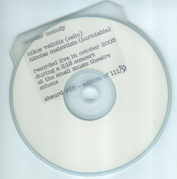 Nicolas Malevitsis is probably best known for his Absurd label, releasing CDs and CDRs of all kinds of experimental music, but he has dabbled around himself with experimental music too. Here he releases a recording of himself on turntable and Nikos Veliotis on cello. Veliotis released an excellent solo CD of his drone related cello playing on Confront (see Vital Weekly 405). On this almost eightteen minute recording, Veliotis takes the leading part with some soft and subtle playing of his cello and maybe a bit of delay on the microphone. Long sustaining sounds occur over which Malevitsis improvises with obscure scratches of vinyl, rather than making long spins. In the second half of the piece both sounds seem to collide together and play unisono. Nice work, but a bit short. (FdW)