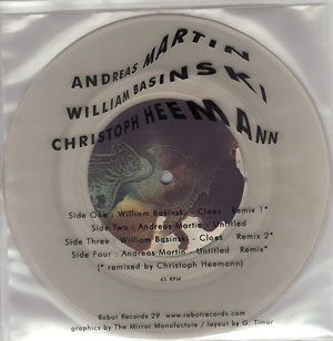 Format: do-7inch Label & Cat.Number: Robot Records 29 Release Year: 2003 Note: clear vinyl, printed clear inlay, lim. 400 Price (incl. 19% VAT): €16.50 More InfoAuf Single 1 nebulöse Drones von BASINSKI, und eines der schönen, glasklaren Akustik-Gitarren-Stücke von MARTIN, auf Single 2 werden beide Stücke von HEEMANN in gekonnter Art und Weise remixed. Auf schmuckem klaren Vinyl, mit durchsichtigem, bedrucktem Beiblatt, lim. 400 copies.“ the occasion of the January 25th, 2003 concert appearances in Austin, Texas at Ceremony Hall. Includes an amazing new recording for solo guitar by Andreas Martin along with an early composition for tape and electronics by William Basinski. Three sides feature remixes by Christoph Heemann. Both records pressed on clear vinyl with full color labels. Includes a clear acetate insert all packaged in a transparent sleeve. An edition of 400 copies." - label description. |