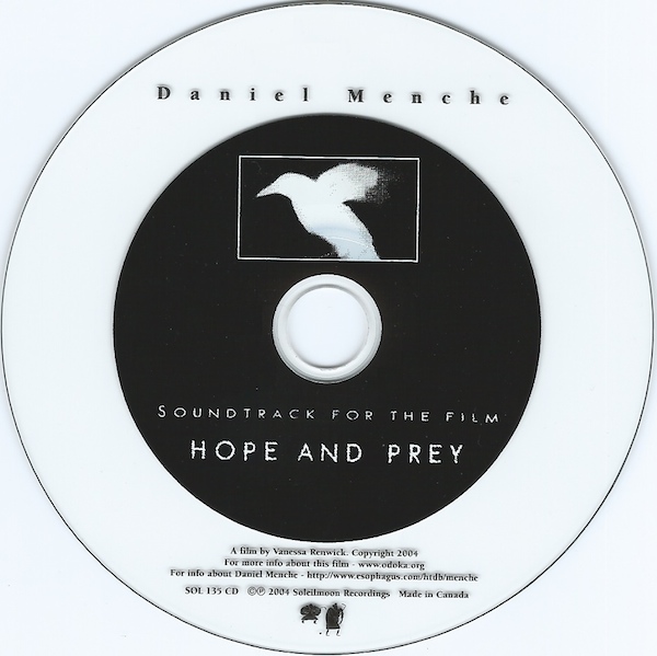 Format: mCD Label & Cat.Number: Soleilmoon SOL 135 CD Release Year: 2004 Note: lim. 500 Price (incl. 19% VAT): €7.50 More InfoSoundtrack zur Film-Installation “Hope and Prey” von VANESSA RENWICK, nur 250 Stück gibt es über mailorder weltweit, der Rest wird bei den seltenen Aufführungen verkauft !!!!!“.. As with all of his recordings, “Hope and Prey” offers an intensely powerful and beautiful listening experience. Surprisingly, Daniel Menche’s work has rarely been heard in film or television productions. Although his compositions have been used in short films, this is the first time he was commissioned to create the sound for a new film, in this case, “Hope and Prey” by Vanessa Renwick. The soundtrack, presented here, is a 20 minute composition of powerful and graceful music that richly captures the ferocious nature of Vanessa Renwick’s film. Both artists are based in Portland, Oregon, and are individually very active in the underground art scene. Their collaboration is an engrossing fusion of visceral sonics and powerful ethereal imagery that has been performed in live situations as well as gallery installations. “Hope and Prey” will never be officially released as a film since it is an installation for 3 projectors and can only be experienced in the environment it was designed for. Yet this soundtrack release is available in a limited edition of 500. Half of the pressing will be sold wherever Hope and Prey is presented, and the other half will be offered through normal distribution channels. With an extensive discography and a long record of highly regarded performances nationally and internationally, Daniel Menche’s music has reached a wide spectrum of listeners across many genres.” [press release] |