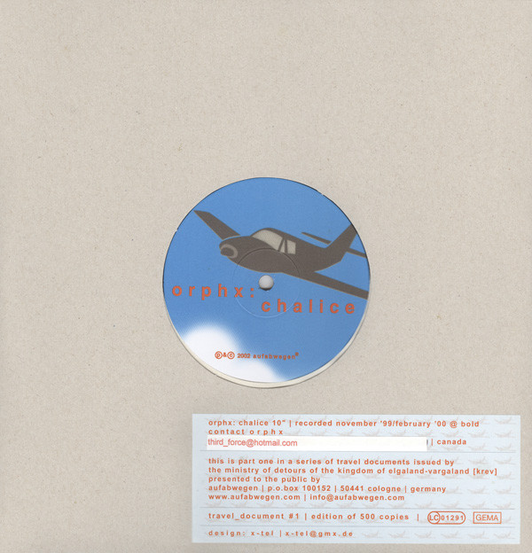 Price (incl. 19% VAT): €15.00 More InfoNeues Klangextrakt der starken Kanadier, enthalten sind 4 Stücke im Niemandsland zwischen ambience und Rhythmen, wie immer gehen ORPHX sehr elegant, kompakt und doch behutsam vor...das ganze als erste Dokument einer neuen „travel document“ series, präsentiert von KREV (the kingdom of elgaland-vargaland).A new & strong 4-track 10“ by the canadian duo, who walk into no-man-lands between ambience and rhyhtms, as always they work very elegant, compact but also careful with sounds.. “ CHALICE sees ORPHX walking on new ground. four tracks, that cross the bridge between dubby basic channel-style grooves and crunching pan sonic distortion. amusement for commutors world wide.” [press release] www.aufabwegen.de |