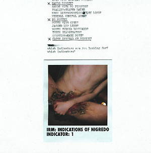 Price (incl. 19% VAT): €15.00 More Info"... IRM hat sich für Indications of Nigredo (Seger 23, 12“) mit dem Bassisten Mikael Oretoft verstärkt, der Jarls Knurschelektronik mit dunklen Twangs durchsetzt. Vor dieser sich langsam aufbauenden Wall of Sound wirken Bladhs Einwürfe seltsam dünn und wie kastriert. Der grusig harsche Noise kommt als gnadenloses Mahlwerk ins Rollen, die Stimme klingt immer gequälter und panischer. Wieder gefasst, stellt sich Bladh einem zweiten Härtetest und verliest die Versuchsanordnung. Dann überdröhnt und umflattert ihn ‚Indicator 2‘, ein Sturm aus Noise und Eis, unter dessen Pfeilhagel er sich als Hl. Sebastian windet. Beatkaskaden und zeitlupiges Bassgedröhn geben der Inszenierung einen rituellen Anstrich. Bladh schreit wie am Spieß Parolen, um anschließend seine Wunden zu lecken. Ist der wirkliche Name des jungen Mannes Narziss? Oder Marsyas?" [Bad Alchemy]"On the theme of alchemy and the topics of shame vs. bodily self infliction, IRM makes way for a new start after the inspired “Virgin Mind” double-disc set from 2005. These are new recordings with the new member Mikael Oretoft joining on bass. Two long tracks - the first being an intense up-building, deep pulsating number with both spoken and rough vocals, volcanic exaggerated bass noise and doom-laden atmosphere. The second more of an aftermath with its downspiralling, almost dreamy character of echoing tones, ripping clangs and chilling audio-schmerz. In total over 23 minutes of music in a glossy colour sleeve with gross artwork and a small insert. Edition of 500 copies." [label info] "... What fascinates with IRM's approach to power electronics is the intelligent construction of the works. Apparently it is not the question of shocking the listener with the sounds of collapsing electronics. More likely the trio invites you into dark territories of electronic sound, - territories that in the first moments seems harmless, but soon after turns out to be a true noise monster. A noise monster, where the emotional impact remains and thus makes the storm of crushing electronics even more overwhelming as they attack the listener. A true masterpiece of apocalyptic art."[NM / Vital Weekly] label website: www.segerhuva.se |